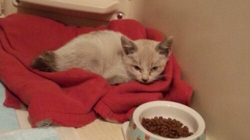 ねこスペック お医者さん情報より生後2か月、メス サバトラ(かなり白に近い) シールポイント 右足打撲、脱臼や骨折はなしお注射されてきました。診察料は病院でもってくれた 先生、ありがとう。体重 560g 普通の猫の半分しかない…。 とりあえず1kg超えない…